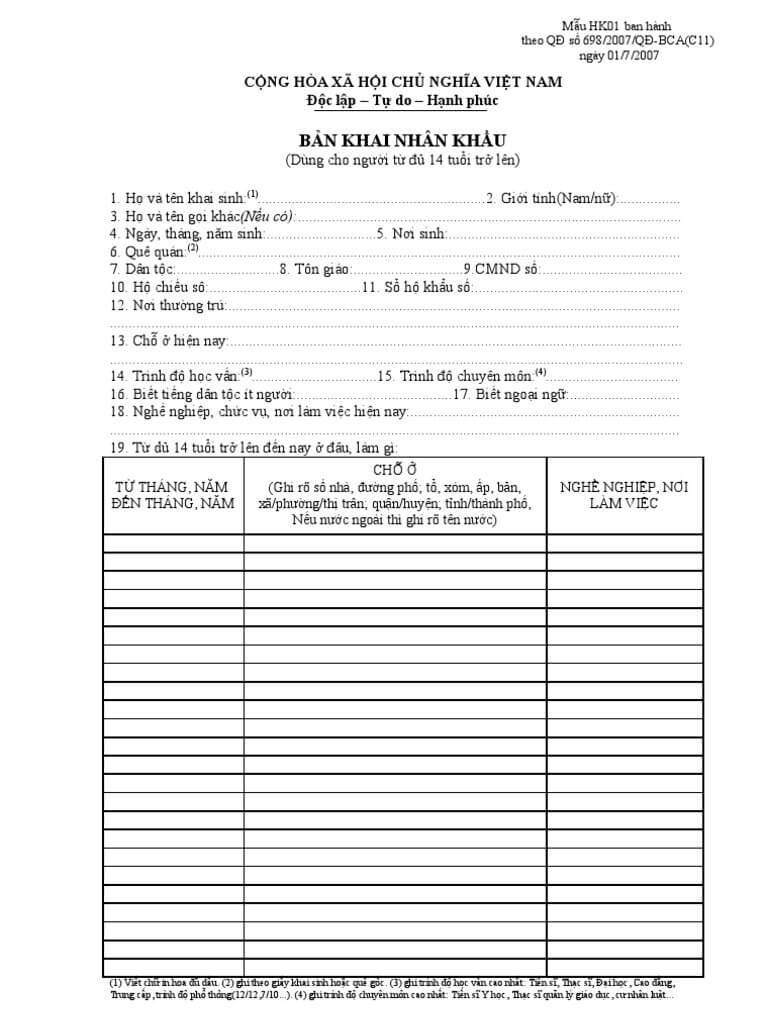 • Mẫu bản khai nhân khẩu HK01